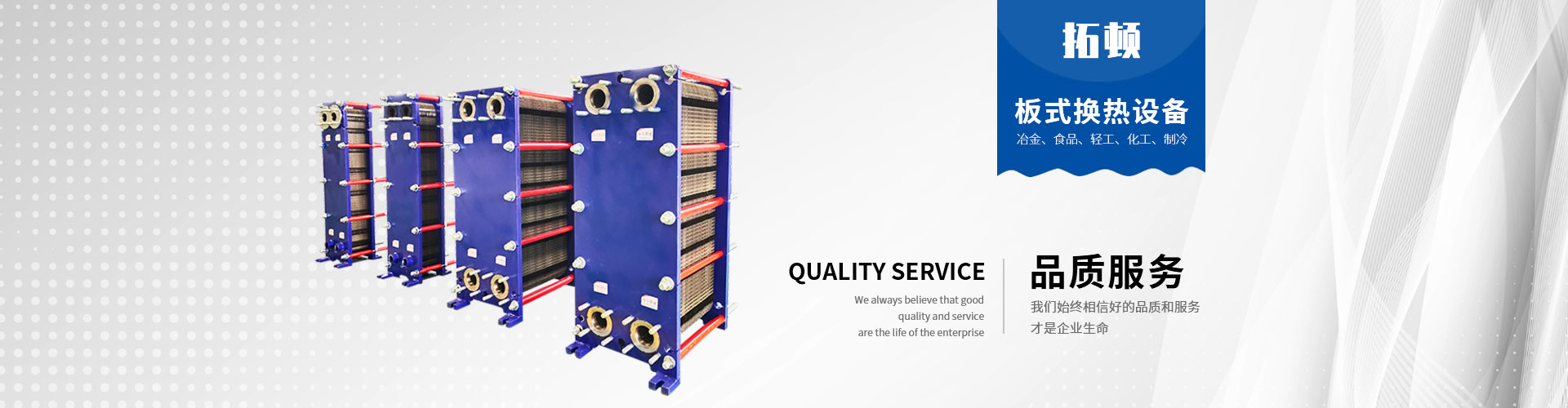 經(jīng)過(guò)持續(xù)努力,拓頓取得了質(zhì)量、健康和環(huán)境體系的“三標(biāo)一體”認(rèn)證、美國(guó)ASME 認(rèn)證。制造許可證等體系認(rèn)證; 公司以8大族群30余種換熱產(chǎn)品為載體, 為化工、冶金、供熱、機(jī)械油冷、醫(yī)藥、造紙、輕紡、船舶、石油、電力、集中供暖、空調(diào)制冷、食品飲料、海水淡化、海水養(yǎng)殖,生物質(zhì)能分布式能源等行業(yè)提供個(gè)性化、專(zhuān)業(yè)化的解決方案用于加熱、冷卻、蒸發(fā)、冷凝、殺菌毒、余熱回收等。